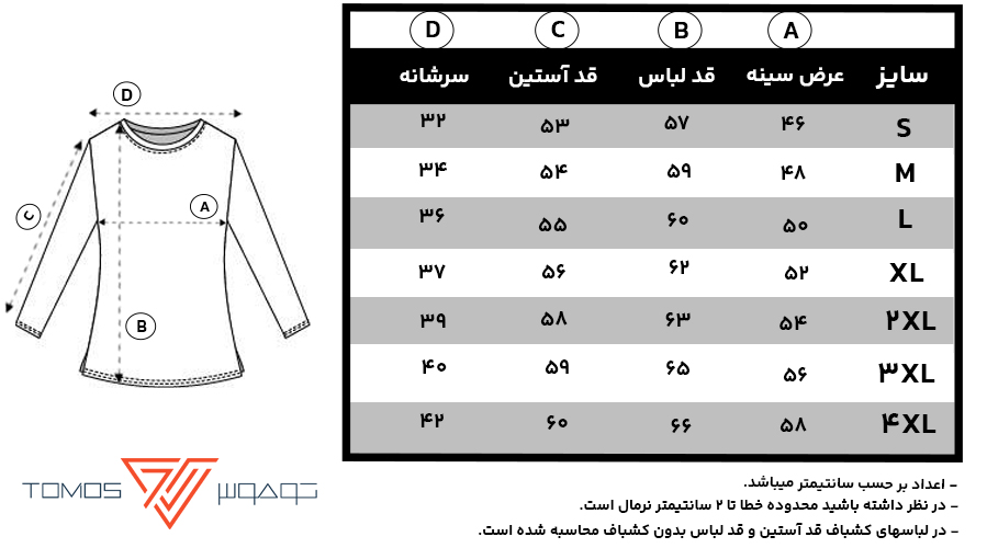 اندازههای درج شده در جدول سایز ممکن است ۱ الی ۳ سانتیمتر خطا داشته باشد.