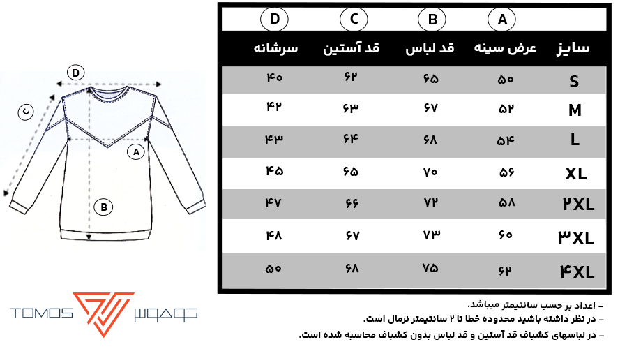 اندازههای درج شده در جدول سایز ممکن است ۱ الی ۳ سانتیمتر خطا داشته باشد.