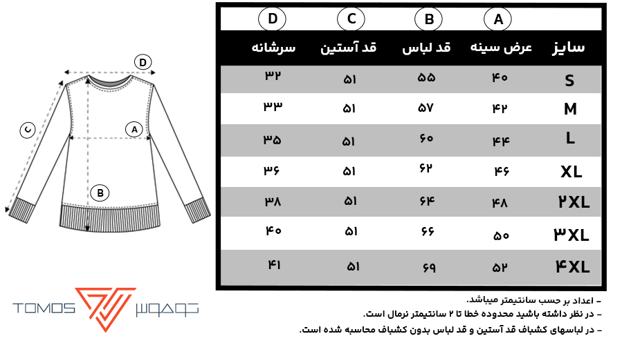 اندازههای درج شده در جدول سایز ممکن است ۱ الی ۳ سانتیمتر خطا داشته باشد.